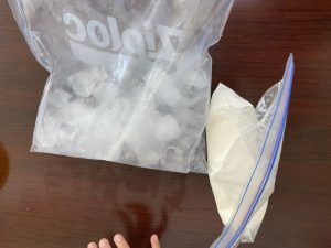氷と塩を入れた袋に材料を入れて、タオルでくるみます。
