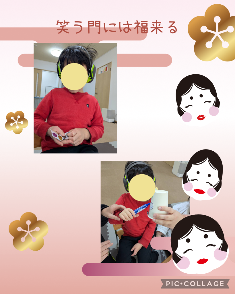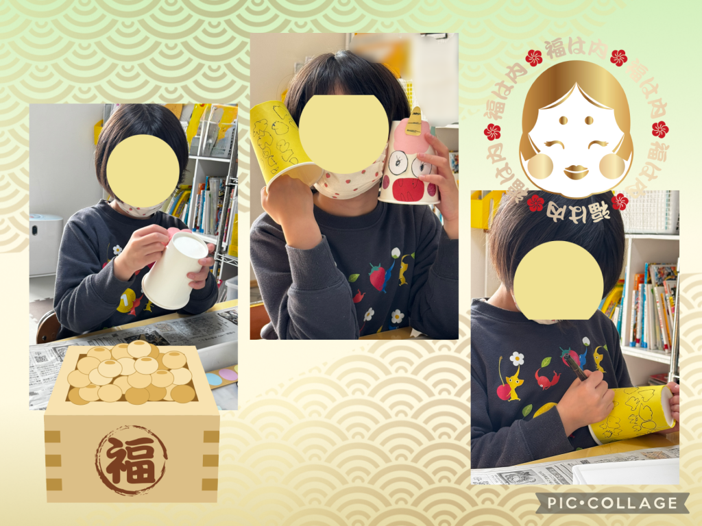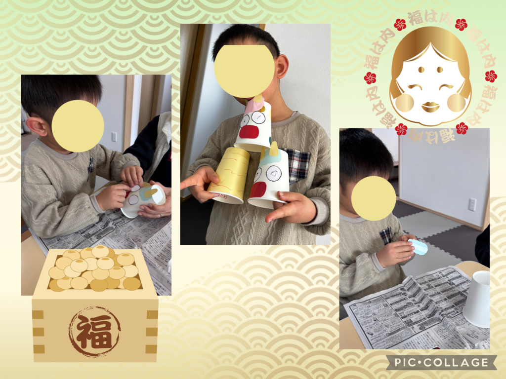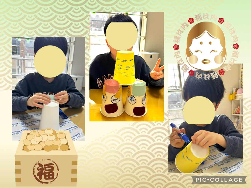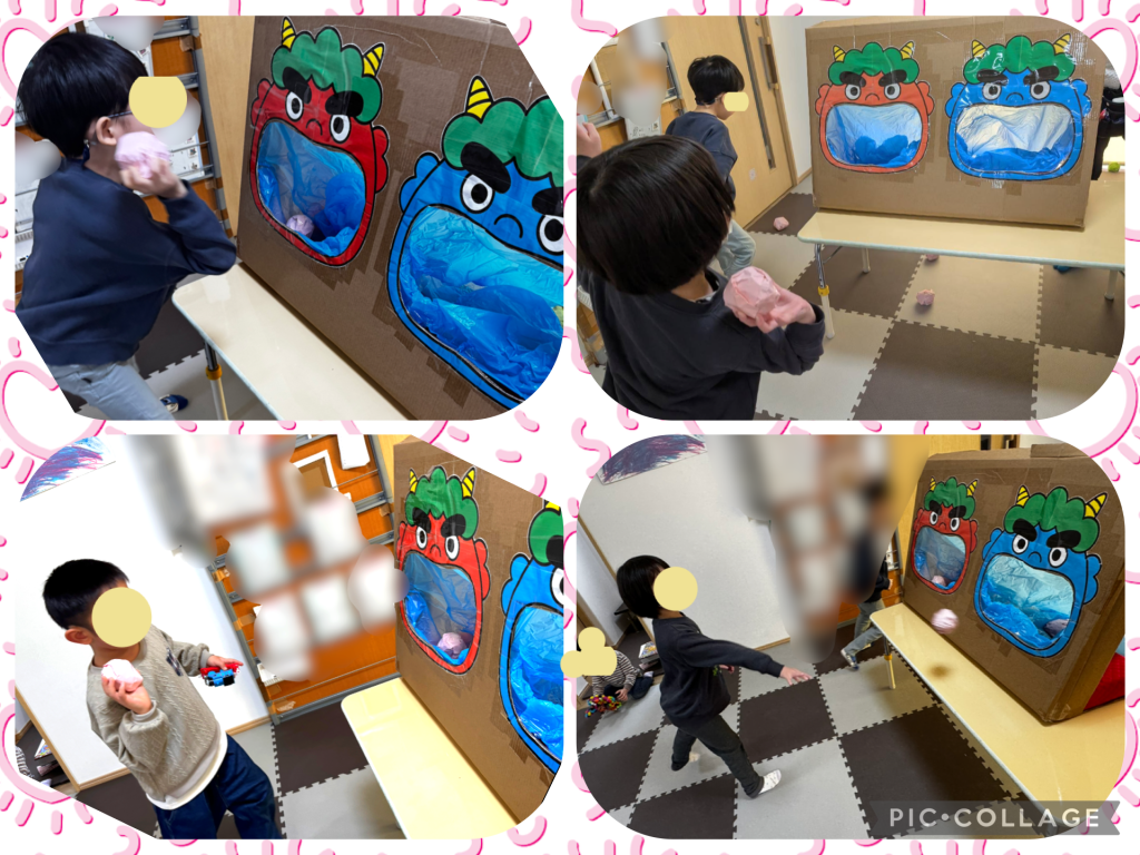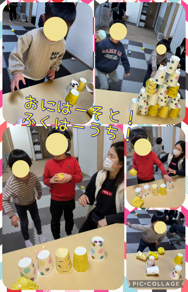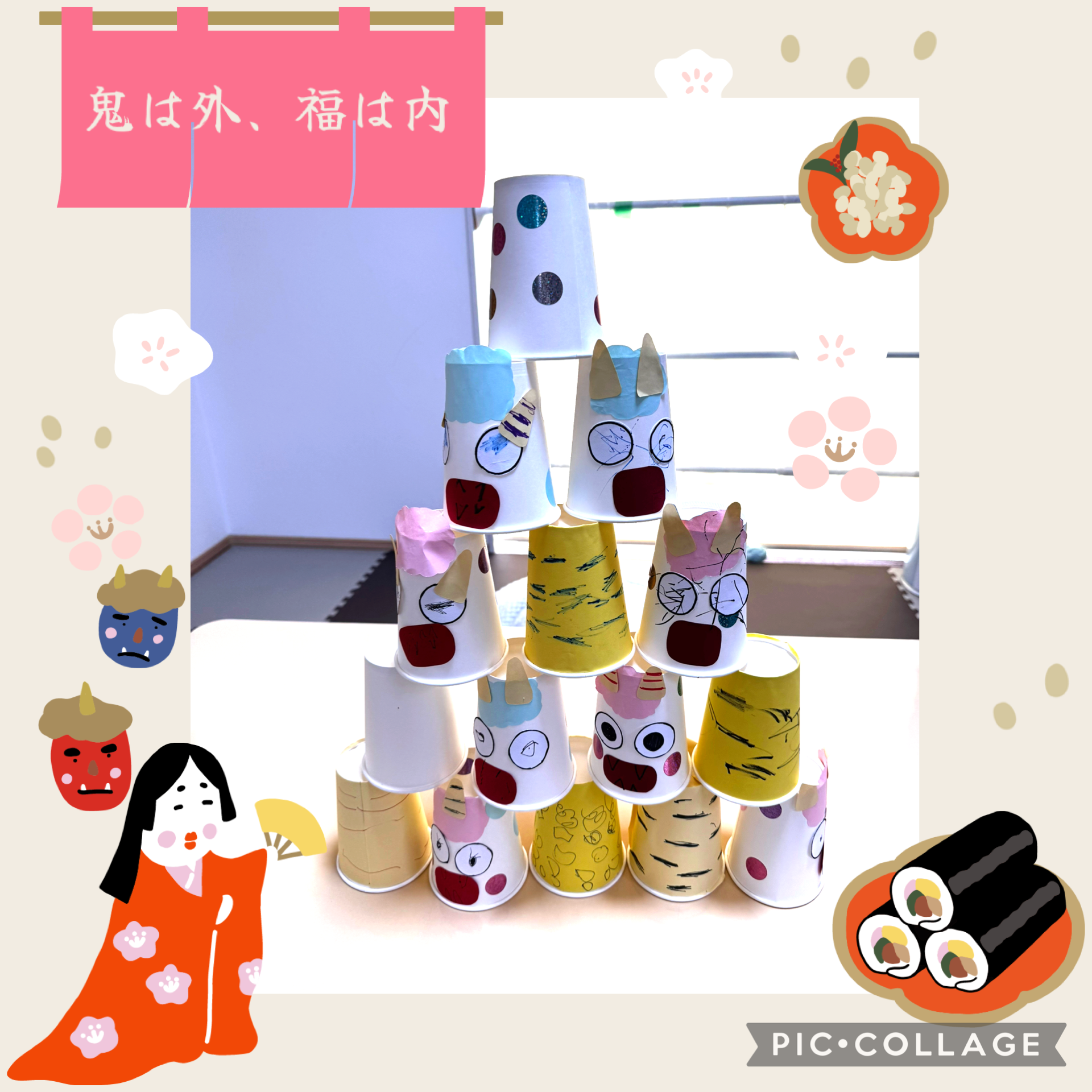完成した鬼さんはピラミッドタワーに大変身!新聞紙で作った豆を手に、「鬼は外!福は内!」と元気な声をそろえて豆まきをしました🫘お友だちと力を合わせて鬼を倒す姿はとても頼もしく、最後は「やったー!」と達成感いっぱいの表情が見られました。季節の行事を通して、楽しみながら協力する大切さも感じられる一日となりました✨
