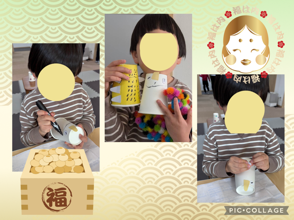 節分遊びを楽しみました👹まずは紙コップを使って鬼さんと鬼のパンツ作りからスタート。目や口の形を考えながら貼り付けたり、好きな色で模様を描いたりと、それぞれ個性あふれる可愛い鬼が完成しました😊
